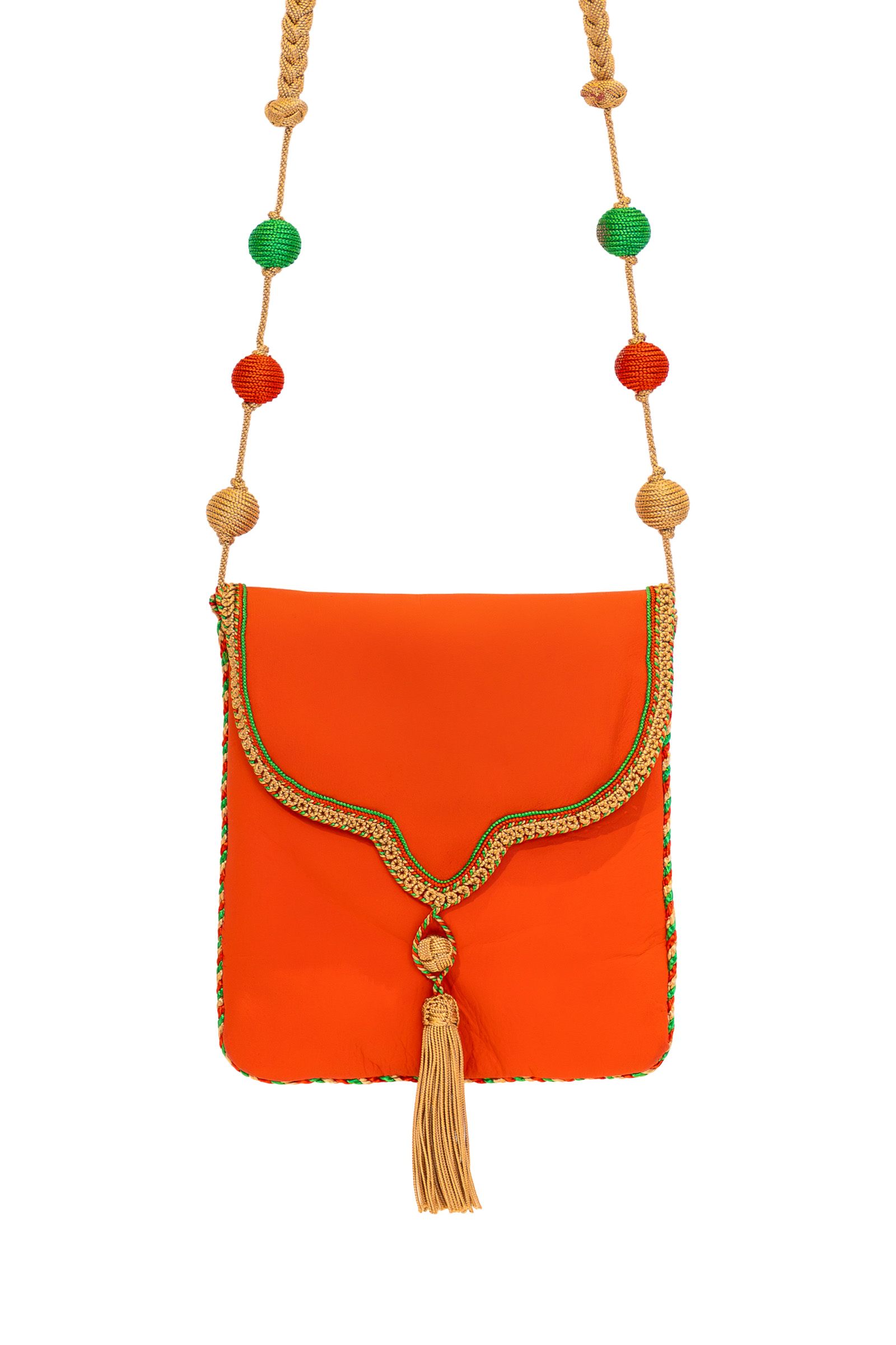 Bolso croosbody con diseños muy propios del norte de Africa, Marruecos. Este es elaborado en cuero, con acabado muy suave al tacto.Tiene una solapa terminada en punta y borla muy fina tejida en hilos de seda. Además la correa tiene 6 borlas decorativas de dos tamaños, también en hilos de seda, que hacen de éste diseño un bolso bellisimo, sofisticado, colorido y muy elegante. Especial para cualquier look.