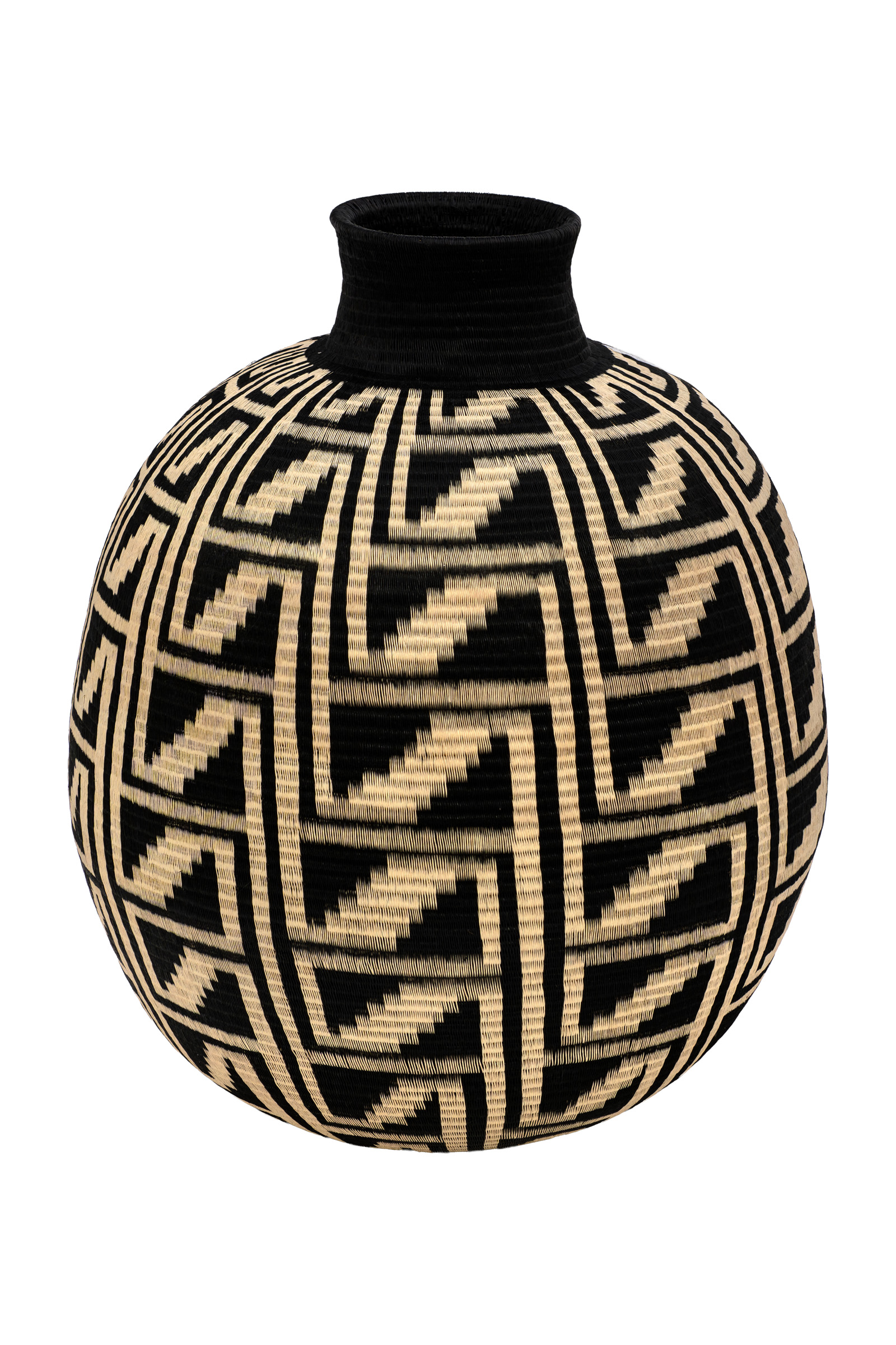 Contenedor en fibra de werregue con diseño de hexágonos, hecho por las comunidades indígenas Wounaan, ubicada en el pacífico Colombiano. Los contenedores de werregue representan la cultura ancestral de los Wounaan y en cada pieza está plasmado la identidad del artesano que lo fabrica, quienes pueden gastar hasta tres meses para su fabricación. Los indígenas tejen la fibra de werregue; que es una palma de tronco espinoso que puede alcanzar hasta los 200 metros de altura. Tejer esta fibra es toda una obra de arte y a través de ella, se pueden producir diversos tipos de productos, con diseños modernos y figuras representativas de la etnia Wounaan. Tener un contenedor de werregue, es tener una pieza decorativa de ensueño y exclusividad, que dan un toque de perfección en el lugar que sean colocados.