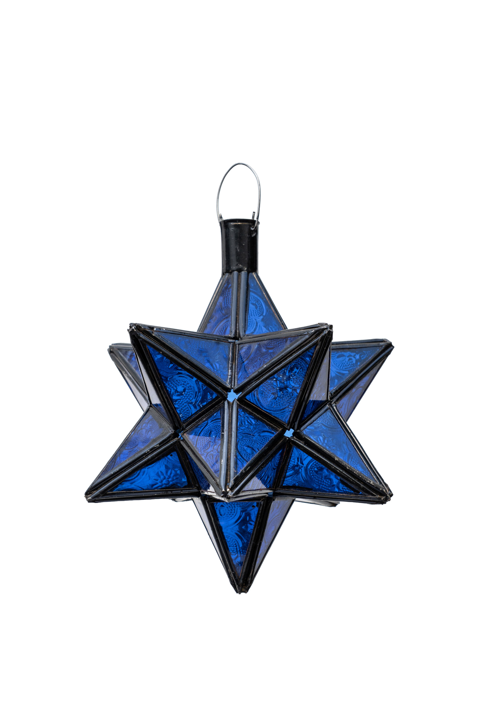 Lámpara tradicional Marroquí en forma de estrella, hecha de forma artesanal en vidrio en tono azul sobre un marco de metal con acabado de brass. Par uso en interiores o exteriores con cobertura.