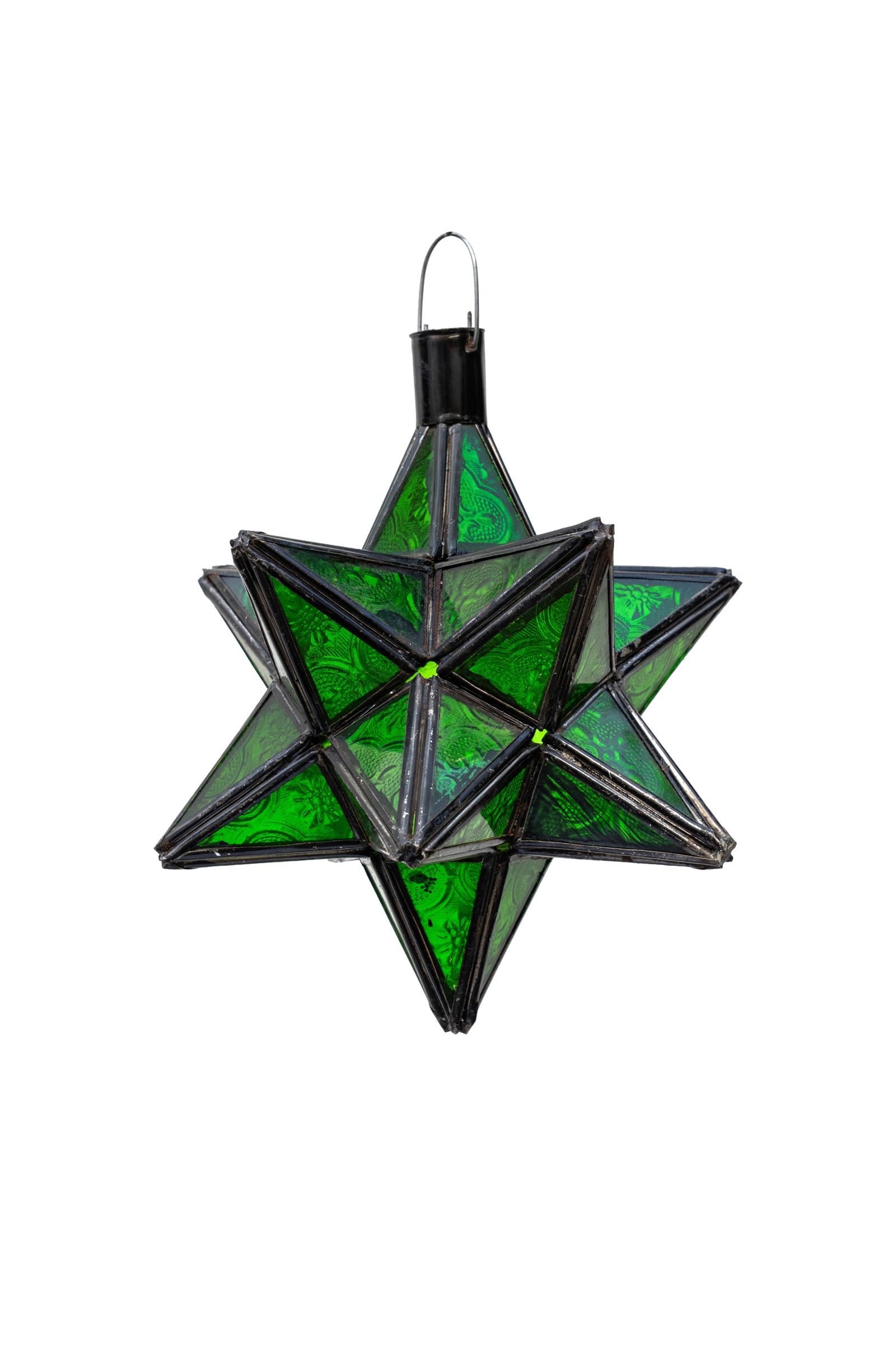 Lámpara tradicional Marroquí en forma de estrella, hecha de forma artesanal en vidrio en tono verde sobre un marco de metal con acabado de brass. Par uso en interiores o exteriores con cobertura.