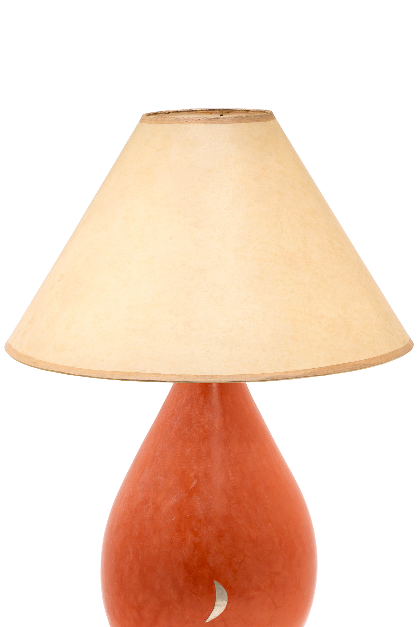 Lampara de mesa hecha artesanalmente en cerámica pintada en color ladrillo con acabado esmaltado y vetas suaves y caperuza en papel pergamino. Puede usarse como punto focal, en interiores como salas de estar o habitaciones, aportando un estilo clásico y sofisticado a sus espacios.