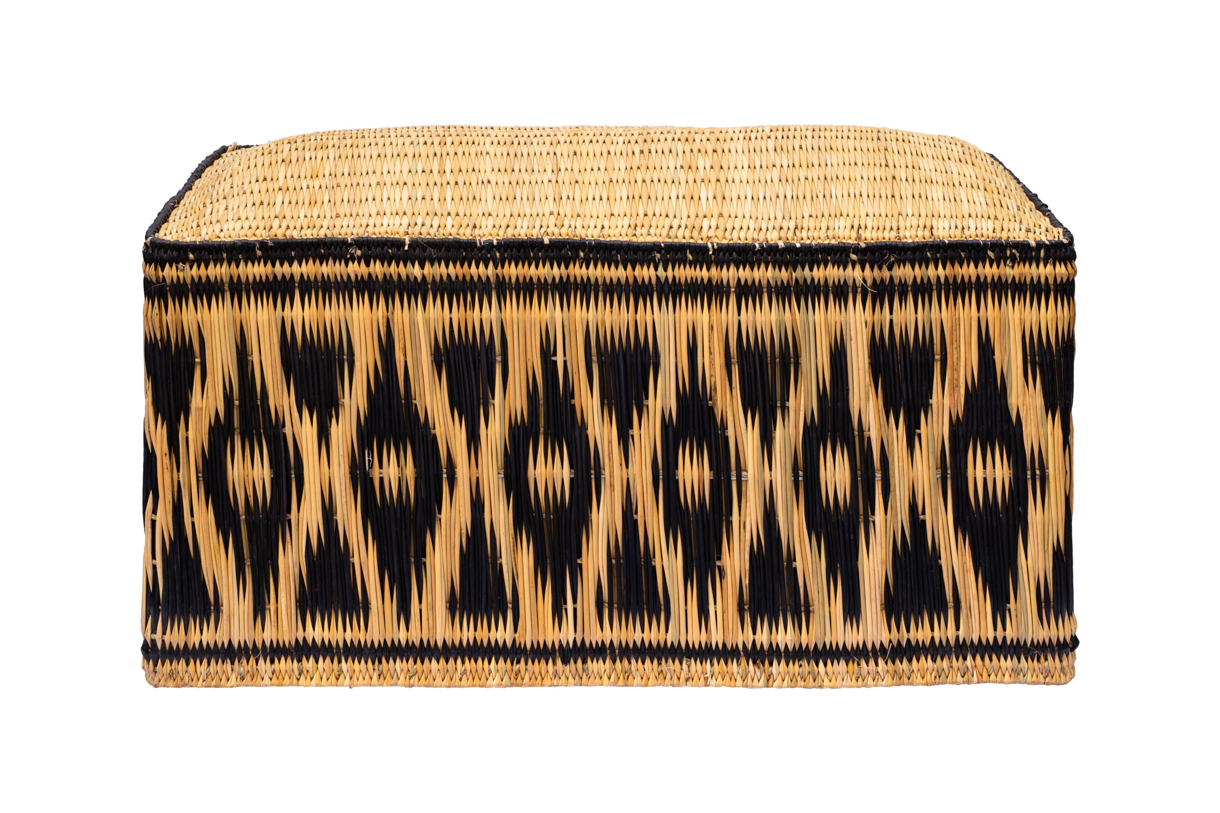 Puf en rafia natural, elaborado por artesanos marroquíes. Hecho con base de madera y forrado en rafia, una fibra vegetal natural flexible y resistente, teñida con tintes naturales en tonos vivos, posteriormente se deja secar y finalmente se entrelazan las fibras formando patrones geométricos como rombos y zigzag. Funcional como reposapiés o como un asiento adicional.