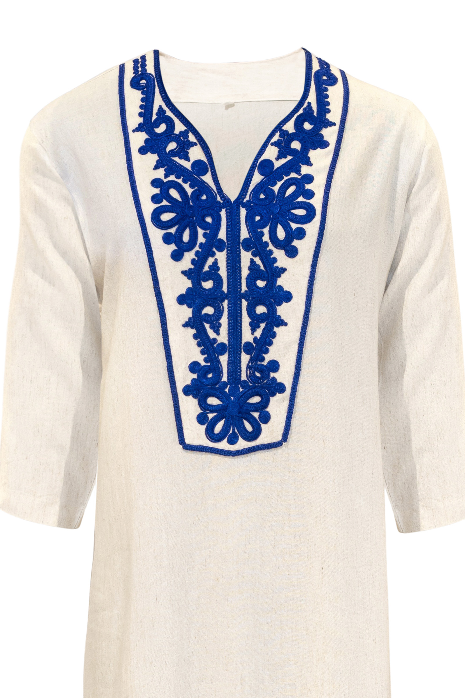 Vestido tipo túnica o caftán marroquí hecho en lino 100% natural, considerado como un material fresco, ligero y de un terminado artesanal. Este vestido no marca el cuerpo, cuenta con manga 3/4 y escote en V, característico de túnicas norteafricanas. El bordado que lo decora en azul cobalto que es el azul del Fez, color que protege del mal de ojo. El vestido aporta un estilo étnico, es atemporal y puede lucirse con sandalias, un sombrero o un accesorio de joyería artesanal.